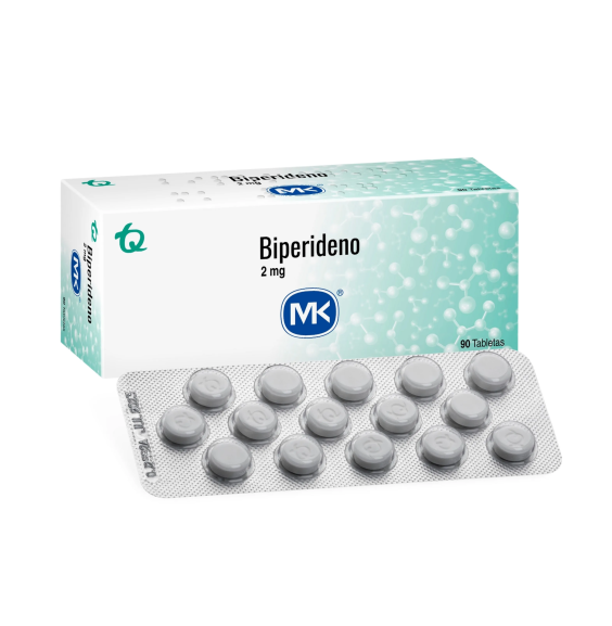 Biperideno MK 2 mg es un medicamento anticolinérgico utilizado principalmente para tratar síntomas parkinsonianos y reacciones extrapiramidales inducidas por neurolépticos, incluyendo rigidez, temblor y movimientos involuntarios.